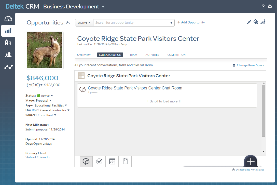 Use the Collaboration tab in the Opportunities area to associate opportunities with spaces in Kona Business and to access those spaces from within Deltek CRM to participate in conversations about the opportunity, create and assign tasks, schedule events, and share files.