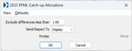 2025 PFML Catch-up Allocations report has been added. It is designed to identify and assist in correcting erroneous general ledger, job cost, and equipment postings related to the 2025 PFML employer catch-up issue introduced in version 25.3. If you have employees participating in PFML programs for Colorado, Connecticut, Delaware, Massachusetts, Maine, New York, Oregon, or Washington, we recommend that you run this report before closing your year for 2025.