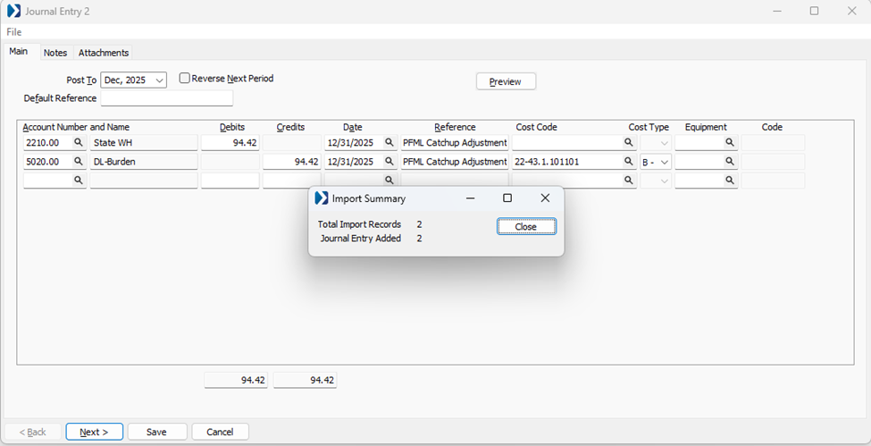 - The journal entry automatically includes Reference: "PFML Catchup Adjustment".