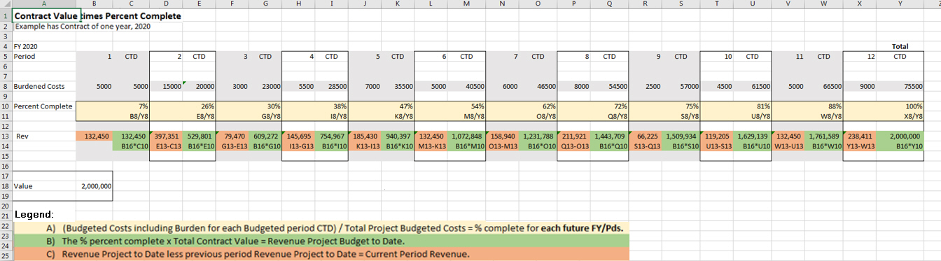 Budgeted Costs including Burden for each Budgeted period CTD / Total Budgeted Costs with Burden [Estimate At Completion] = % complete for each FY/Pds.