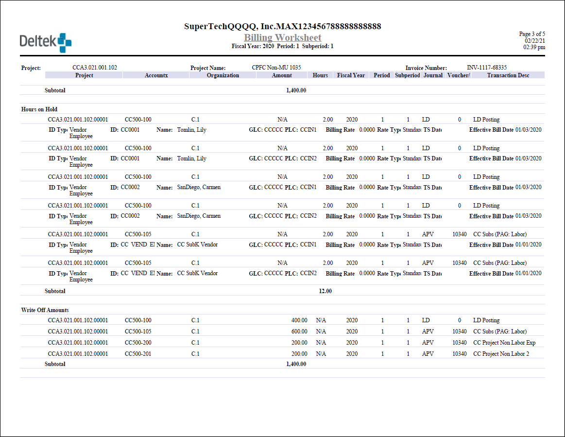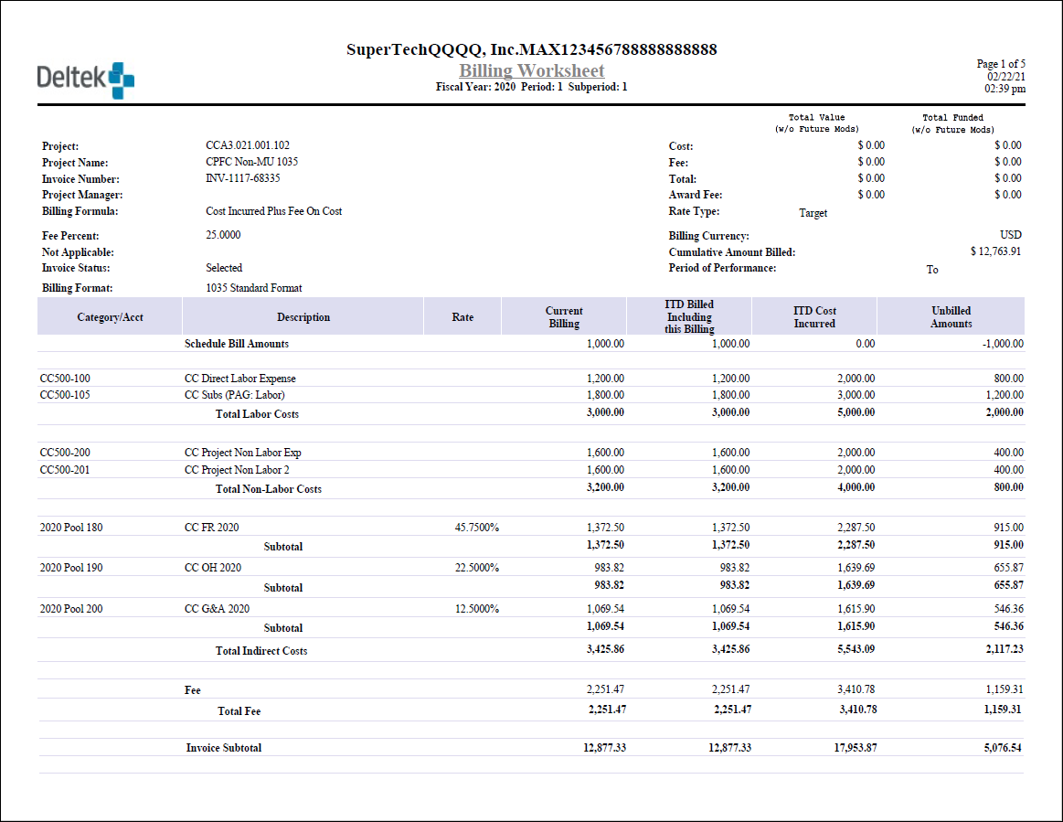 Here is an example of the billing worksheet with supporting schedule for the Cost Plus Fee On Cost (CPFC) billing formula.