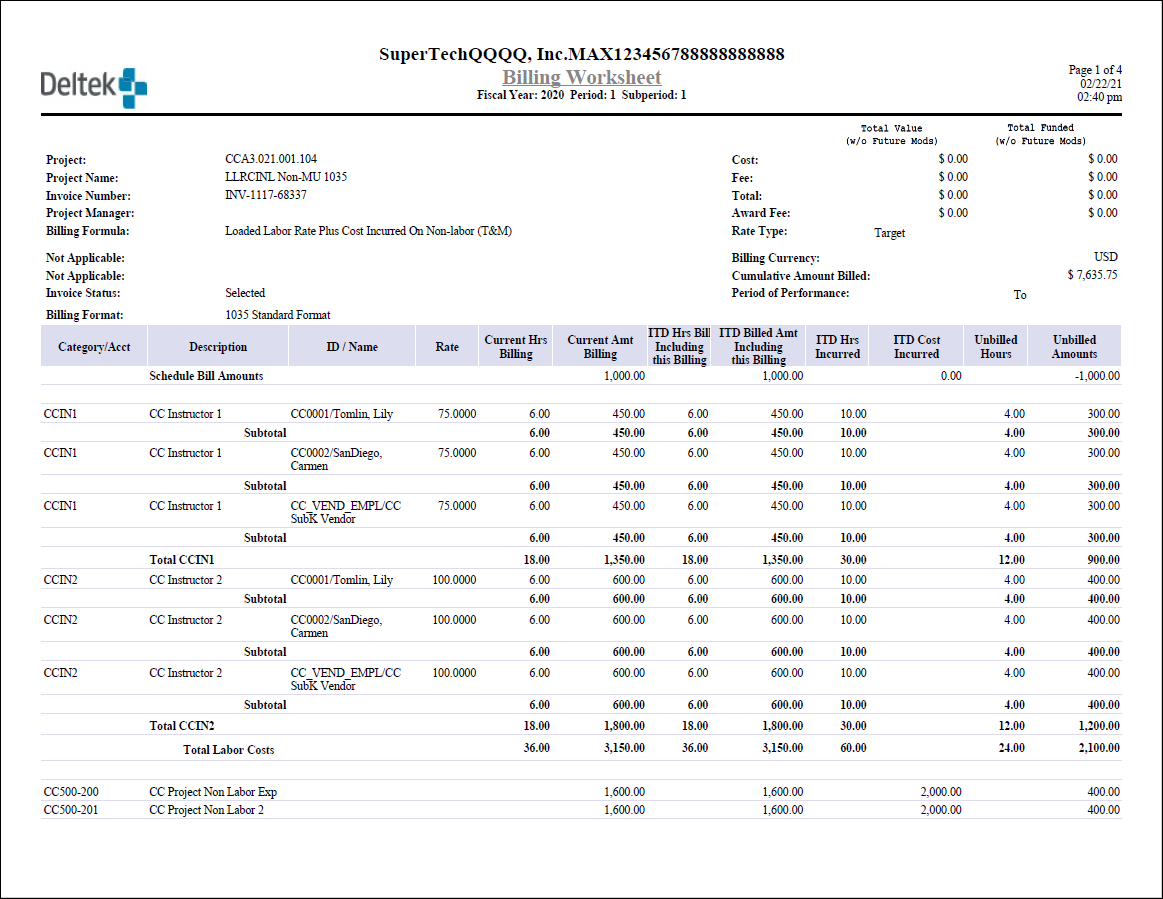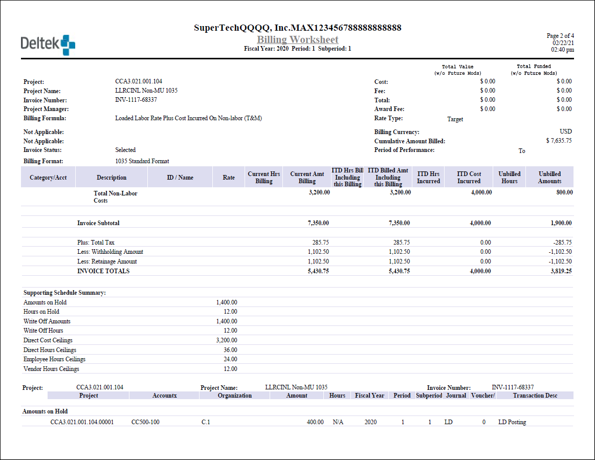 Here is an example of the billing worksheet with supporting schedule for Time & Materials (T&M) projects.