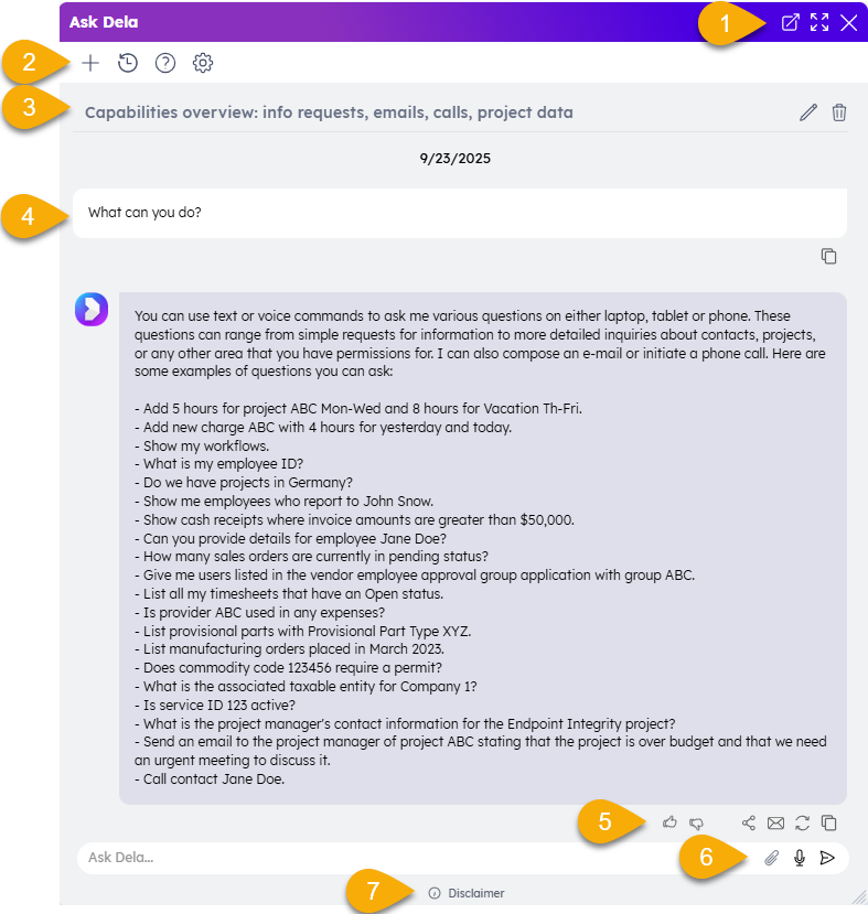 (2) Start a new conversation; view the chat history; ask Dela what it can do; open settings to change the Ask Dela icon location and font size (in the old UI) or adjust the chat font size (in the new UI).