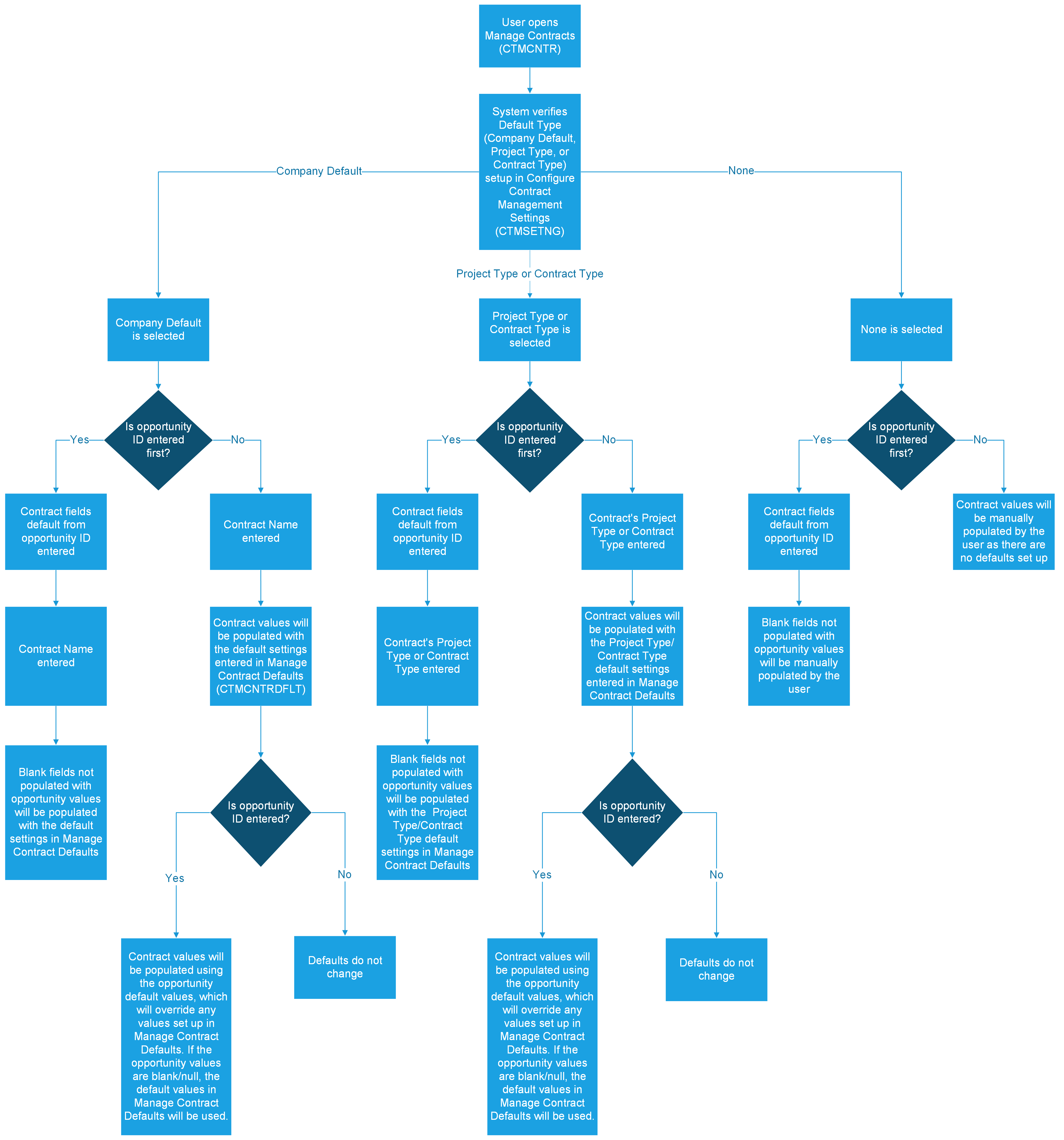 If contract defaults are set up and enabled on the Configure Contract Management Settings and Manage Contract Defaults screens, Costpoint applies the default to relevant fields according to the following triggers and process flow. Note, however, that defaults from the opportunity ID linked to the contract will always override the defaults set up in Manage Contract Defaults.