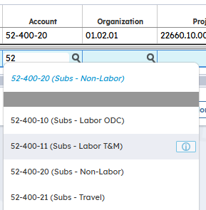 When typing ahead in an editable field, the Info Card icon displays next to the values in the drop-down list. Click the icon to view the Info Card and click Select in the Info Card to add the value to the field.
