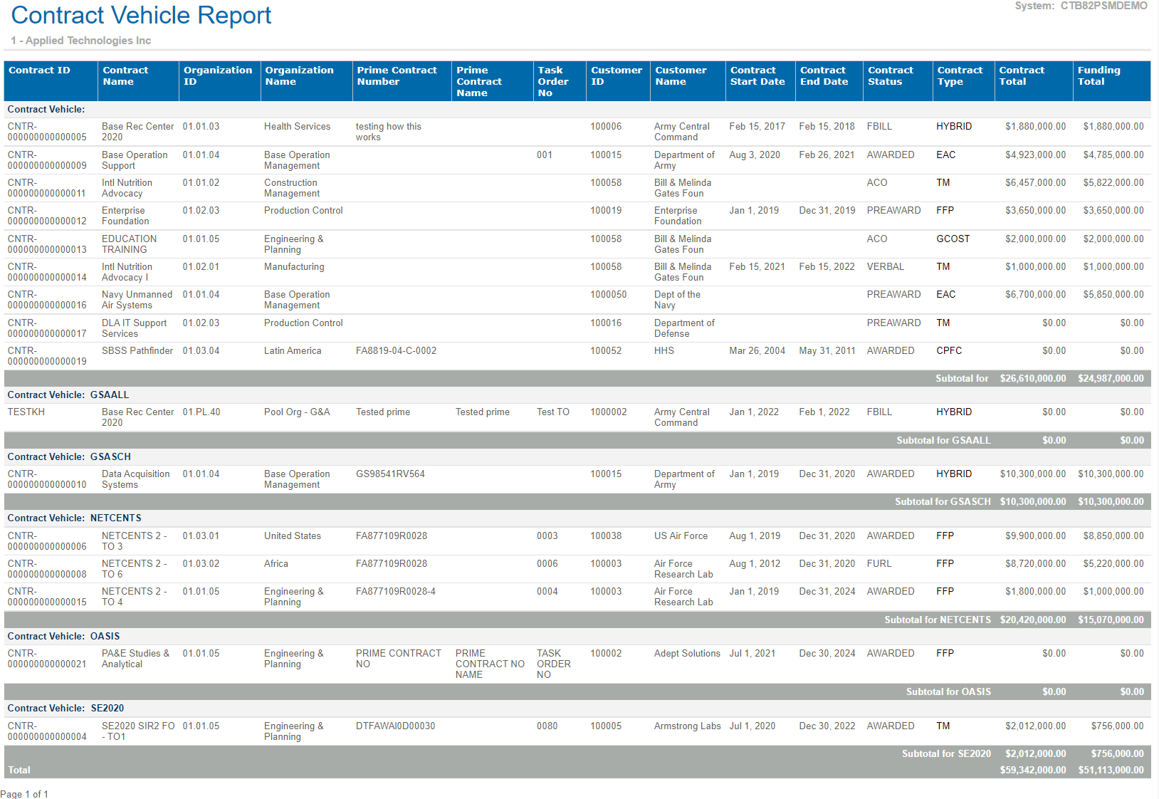 The Contract Vehicle Report includes the Organization ID and name for each contract.