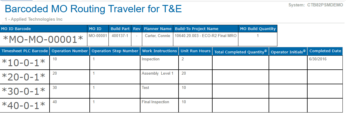 The Barcoded MO Routing Traveler report shows the MO bar code, MO ID and the sequence of steps associated with the manufacturing order.