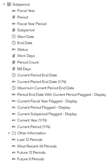 The other query subjects provide additional data related to the data in the fact table that you may want to use or display in your reports. Of special note is the Subperiod query subject. It not only lists accounting period information but also provides a yes/no flag that identifies the current open period.
