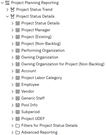 The Filters for Project Status Details folder contains the pre-built filters for the reporting area.
