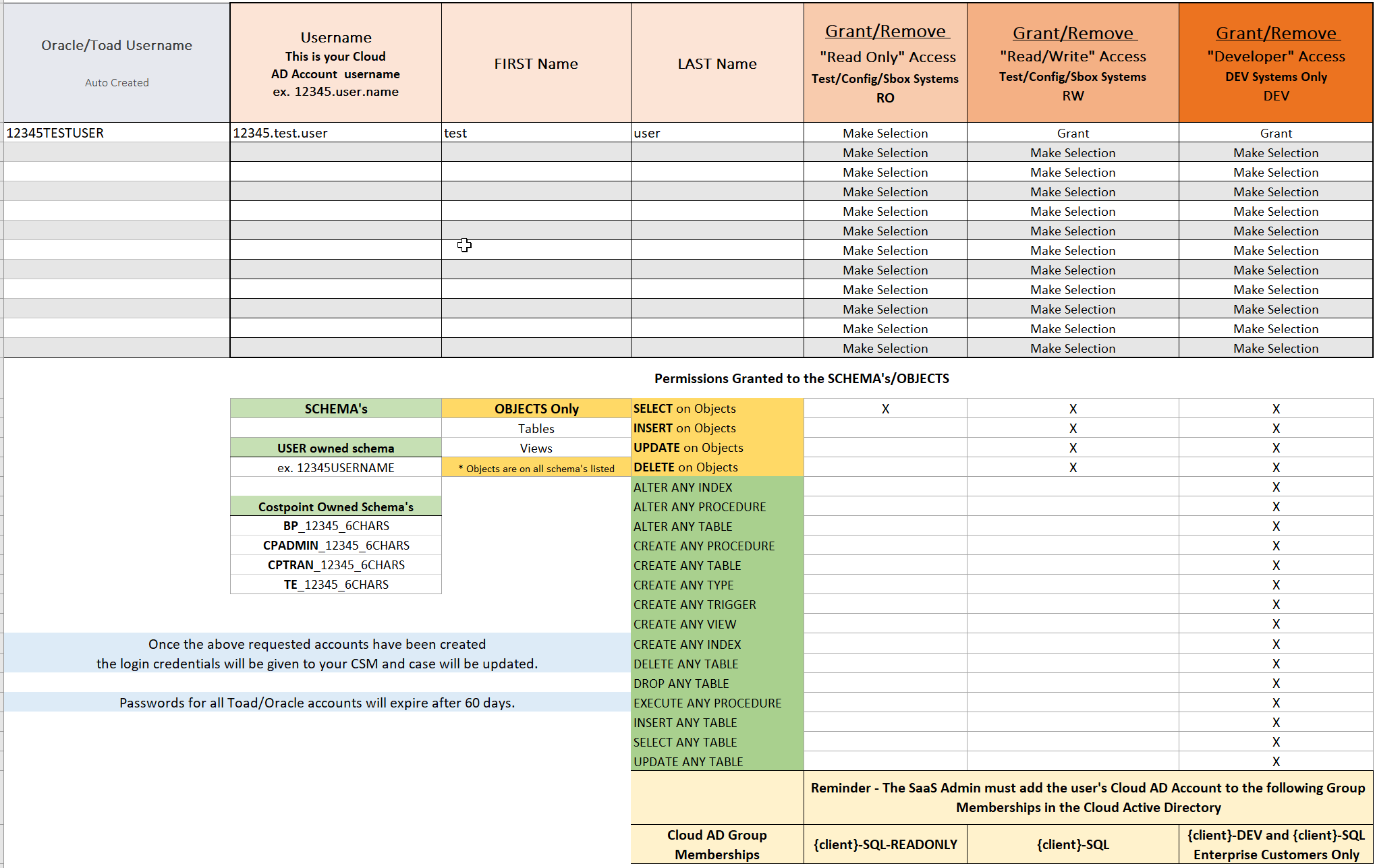 Oracle Access to Non Production Databases service request. The following spreadsheet must be completed when submitting the service request. Please note the varying SQL Rights that are assigned to the SaaS Developers Cloud AD Account depending on which Environment/Database they are working with.