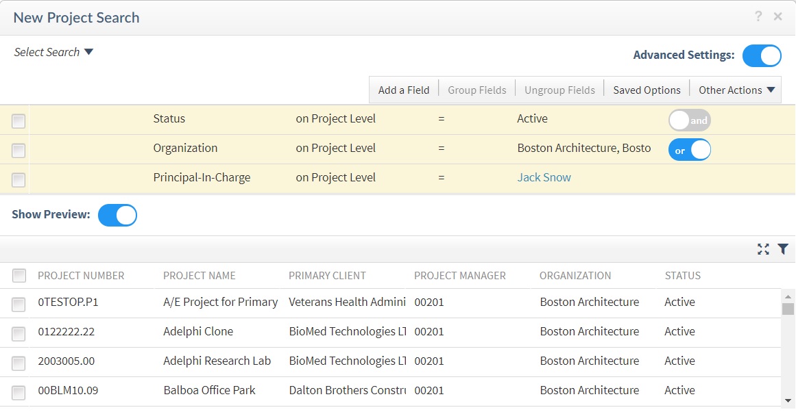 For this example, we will perform a project search for all active projects in the Boston Architecture or Boston Engineering organization with a principal of Jack Snow. We only want those projects with this organization and principal on the top level and will not search the phase or task level.