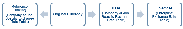 - Conversion to enterprise: Maconomy uses the enterprise exchange rate table from base currency. Therefore, the system always converts via the base currency.