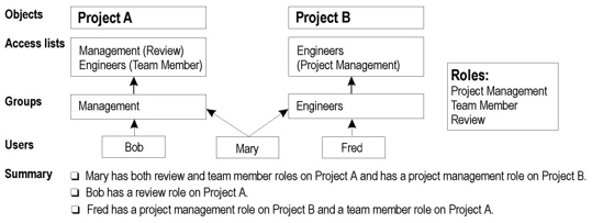 The following is an illustration of the way in which users, groups, roles, and objects are related: