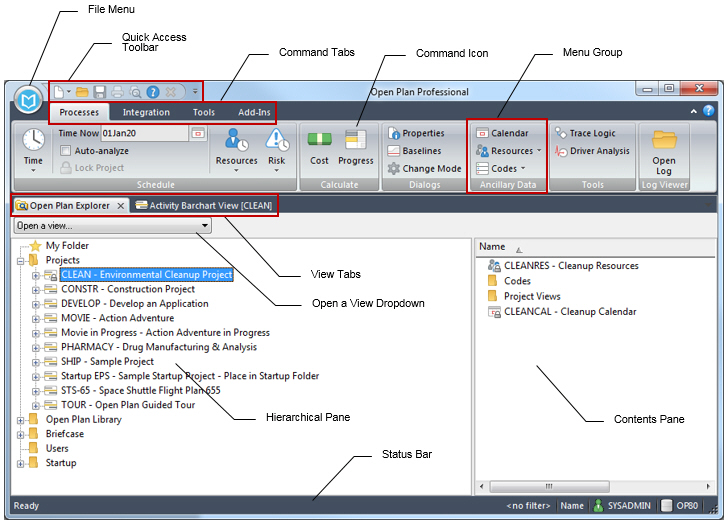 The Open Plan window offers an overview of the various menu options, commands, tabs, icons, and menu groups available in Open Plan.