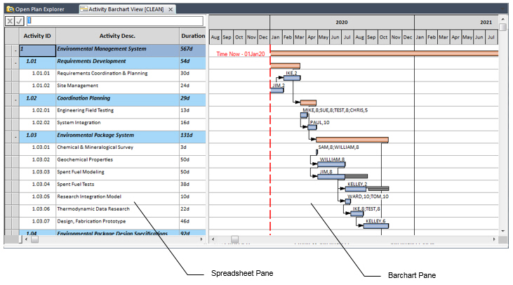 A barchart view displays activities in rows that appear in two panes. The pane on the left is a spreadsheet that displays information in a tabular format. The pane on the right displays information as bars against a time scale. Information about each activity is displayed on a single row. However, you can have any number of bars on a single row. For example, an activity row might contain one bar that shows early dates, another bar that shows scheduled dates, and still another bar that shows baseline dates.