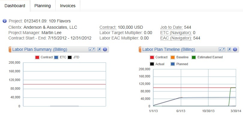 The Project Management dashparts display a summary of the selected project's information on the Dashboard. If your role established in allows you to access the Dashboard, you can see contract, labor, expense, and consultant dashparts even if you do not have access to their respective Planning grids.