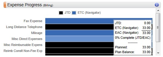 • If there is no JTD or ETC (Navigator) but the Expense Type displays in the grid, the bar is gray and the bar displays No JTD or planned amount.