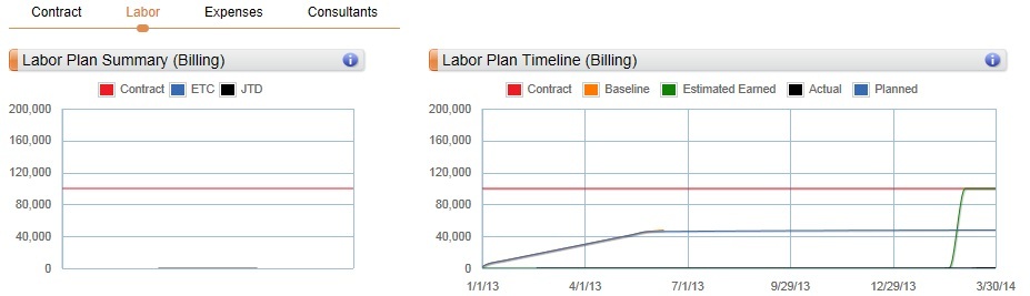 For example, following are the Labor Plan Summary and Labor Plan Timeline charts. These charts display when you select the Labor page. As you update information on the Labor grid, the data on these charts updates to reflect the selected row.