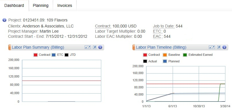 The Project Management dashparts display a summary of the selected project's information on the Dashboard. If your role established in allows you to access the Dashboard, you can see contract, labor, expense, and consultant dashparts even if you do not have access to their respective Planning grids.