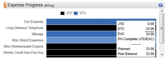 • If there is no JTD or ETC but the expense type displays in the grid, the bar is gray and displays No JTD or planned amount.