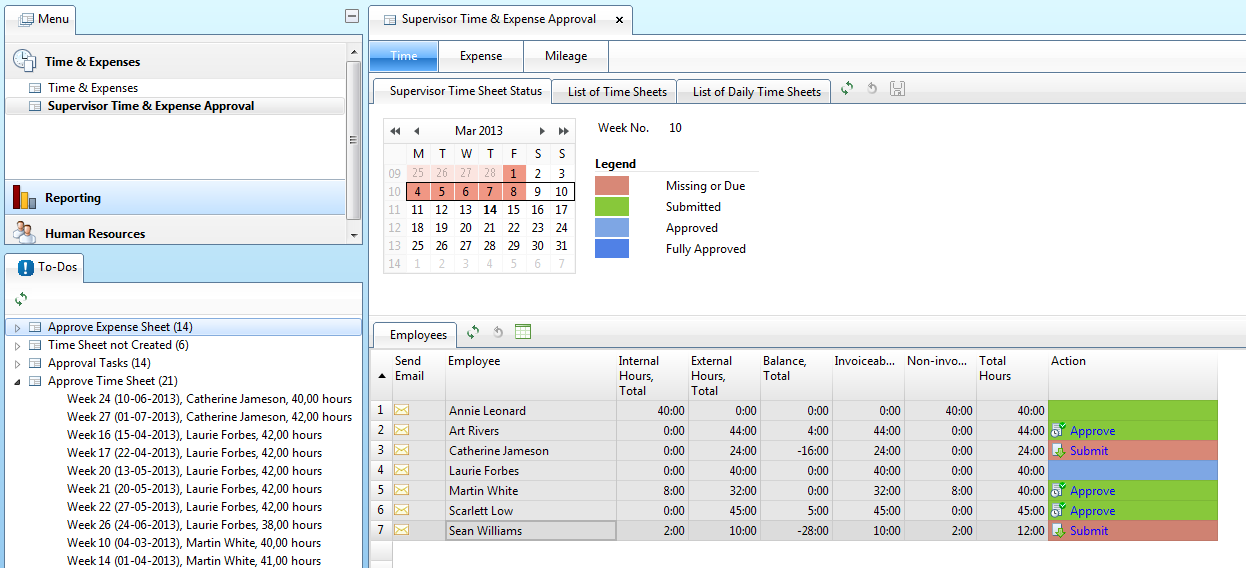 The Line Manager can receive a full overview of all relevant employees. The Line Manager can view submitted time sheets and those not yet submitted (see the following figure). In the same view, the Line Manager can either approve the time sheets or drill down to the single time sheet entries before approving the time sheet.