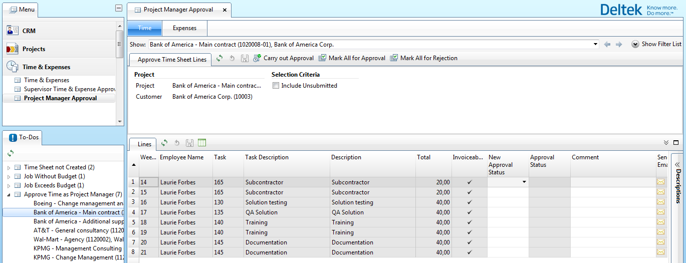 The PM receives a To Do with information about outstanding actions. If the PM rejects any of the hours or expenses, a To Do appears for the relevant employee.