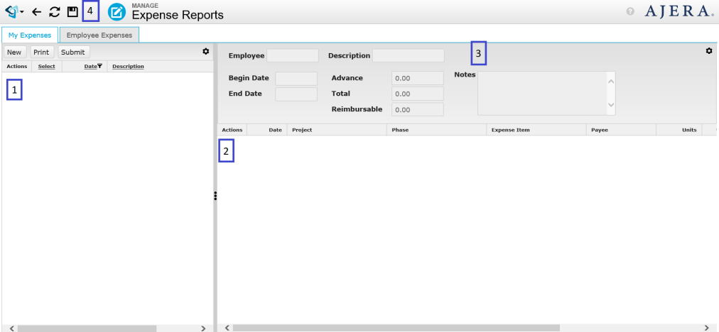 • From the My Expenses tab of the expense report list window, you can view expense reports, create new expense reports, submit expense reports, or print expense reports.