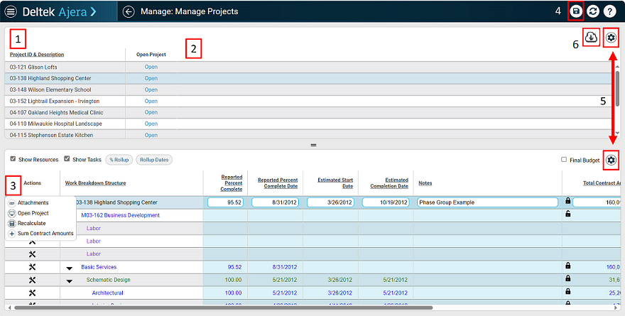With Projects in the browser, you can change the status of the project or phase as needed. You can also edit cost and contract amounts at the project or phase level. When you change cost or contract amounts, those changes are also reflected in the Project Command Center and the Manage Project Task Widget. When you select a project in the project list, you can view the full work breakdown structure (WBS). When changes have been made to the project, the row(s) changed will be bolded. You will be prompted to save changes before exiting. You cannot adjust the WBS or delete phases with Projects in the browser. In addition, you can manage your attachments and easily open the project in the Project Command Center.