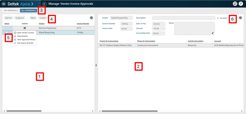 Use the vendor invoice list to select invoices to approve or reject.
