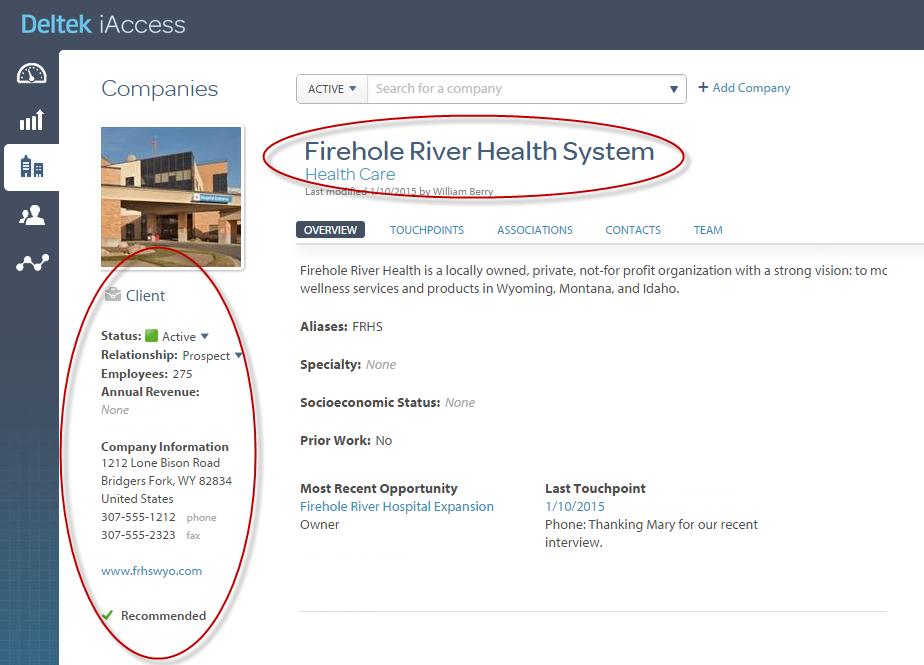 The name and general market for the currently selected company display in the upper-left corner of the Companies area and key data (company types of roles, status, relationship to your firm, number of employees, and so on) display down the left edge.