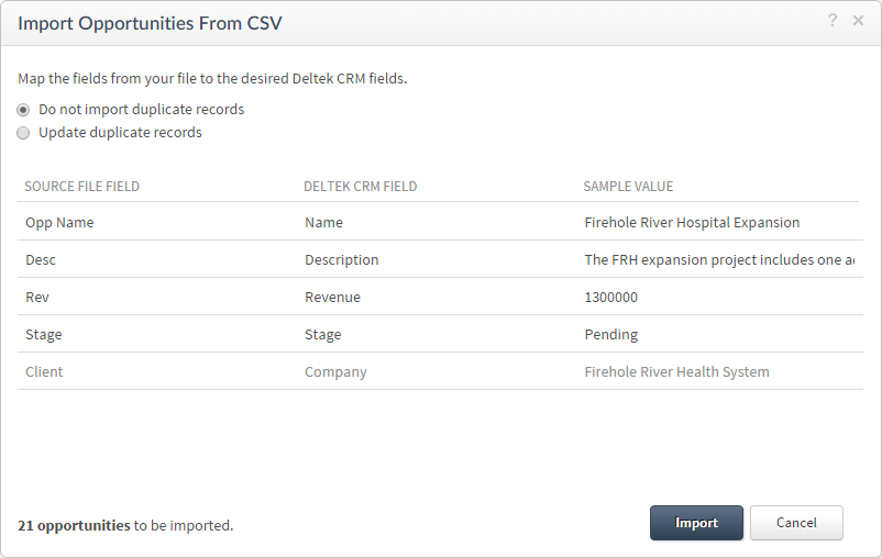 - Select Update duplicate records if you want the import process to update fields in Deltek CRM for an opportunity that already exists. If a field in the existing record is blank or contains information that is different from information in the mapped field in the .CSV file, the field in the existing record is updated with the information from the .CSV file. If you maintain opportunity information in other applications, this option enables you to use the import process to keep the corresponding information in Deltek CRM up to date.