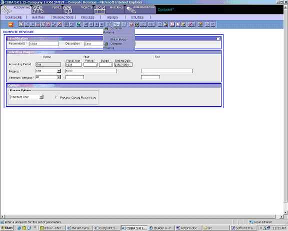 For example, in the Compute Revenue application, you could select two parameter rows – one for project 1003 and another for project 1004 - and start the Compute Revenue action. The system would compute revenue for projects 1003 and 1004.