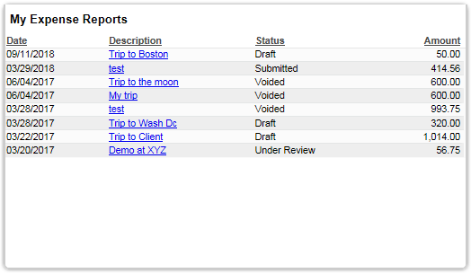 In the Description column, click an expense report description link to open the Manage Expense Report screen in Time & Expense and view additional details about that expense report. The screen opens directly to the record selected.