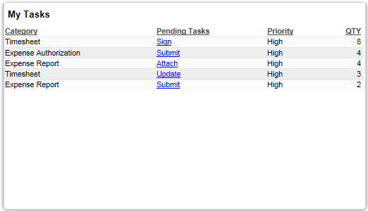 The table displays the category or type of record that requires action (for example, Expense Report, Expense Authorization, or Timesheet) and the type of the pending task (for example, Submit for expense reports and Approve for timesheets and expense authorizations). It also displays the number of tasks currently pending for the category as well as the priority level for the task (High, Medium, or Low).
