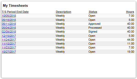 By default, the dashpart displays the 10 most recent timesheets in descending order by T/S Period End Date.