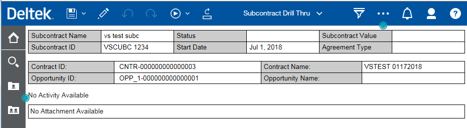 The Subcontract Drill-Thru report displays subcontract details about a customer. You can see this drill-thru when you click the Subcontract # on the Contract Drill-Thru report.