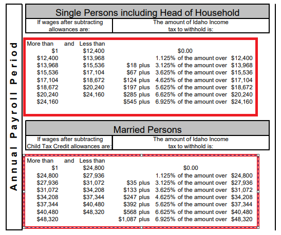 Idaho's 2020 withholding methods, were released June 16 by the State Tax Commission. The highest tax bracket now starts at annual income of $48,320, up from $47,508, for married individuals, and at annual income of $24,160, up from $23,754, for other individuals. Costpoint will be updated to support these tax table changes in MR 7.1.8.
