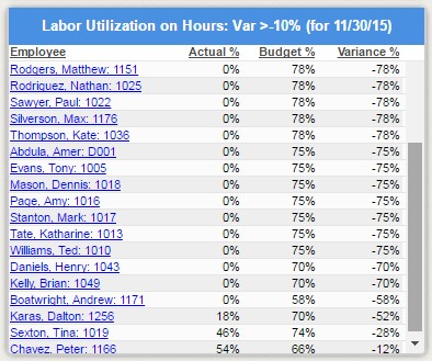The Labor Utilization dashpart is a numerical table that displays labor utilization of employees whose actual labor utilization varies from their budgeted labor utilization. The data on this dashpart comes from Costpoint Planning.