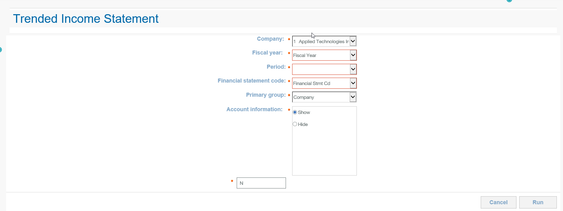The Trended Income Statement report has selections such company, fiscal year, and period.