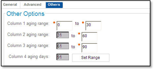 Enter a range to age by in the following three columns. You can edit the default ranges as necessary as long as date ranges do not overlap from column to column. Defaults from 0 up to 30. |