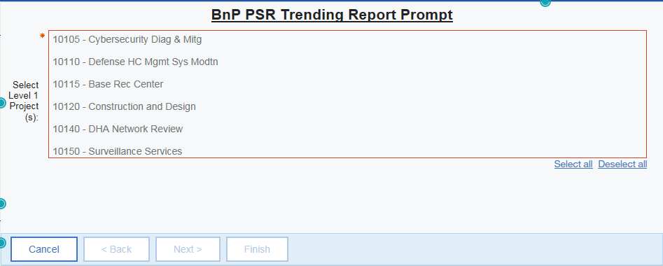 The prompt for the BnP PSR Trending Analysis includes the selection for project .
