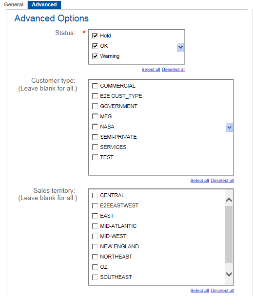 Select the territory or territories of customers you want to include on the report. Territories are established in the Sales Territories table in Costpoint Accounts Receivable. |