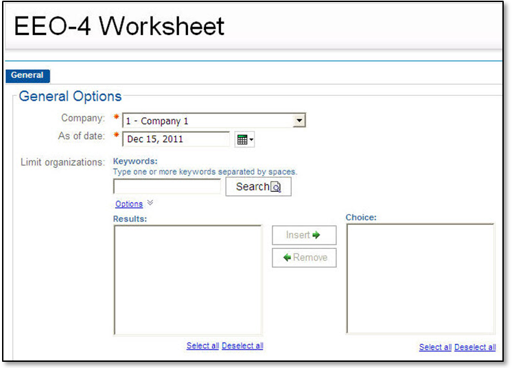 Enter or select the date as of which you want to report EEO-4 data. The worksheet displays the employee counts as of this date. |