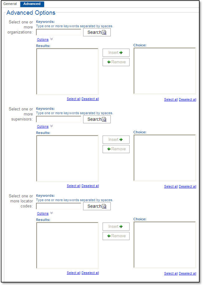 Enter a portion of one or more supervisor names in the Keywords field and click Search to list supervisors to include on the report. You can use the steps in entering keywords in the Keywords fields to return the results you are looking for. |