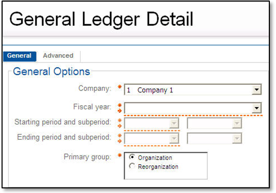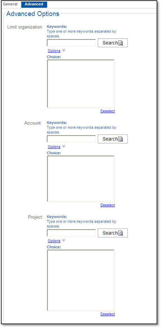 Enter a portion of a specific organization or reorganization that you want to include in the report based on the report sort you selected on the General tab. Click Search. In the search results, select one organization. For example, you know that the organization that you are looking for starts with an A. Enter A in the Keywords field, and then click Search. All organizations that start with A will be in the search results. Select one organization to include in the report. |