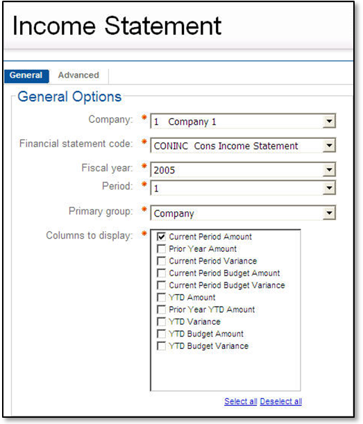 If adjustment periods are available for the selected fiscal year, they are displayed in the Period drop-down list including the adjustment period type which can either be Interim or Final.