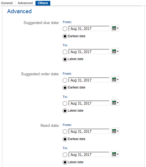 From: — Enter the suggested order start date to use or click the calendar icon to select the date. To: — Enter the suggested order end date to use or click the calendar icon to select the date. Select Earliest date to indicate all dates or Latest date if you do not want any date filters to be applied. These are the default options. |