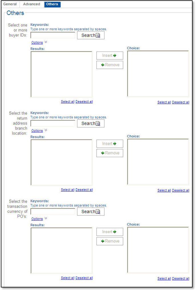 Enter a portion of one or more transaction currencies in the Keywords field and click Search to list purchase orders to include on the report. You can use the steps in entering keywords in the Keywords search fields to return the results you are looking for. |