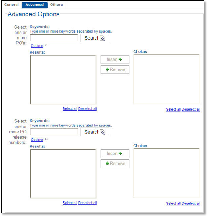 Enter a portion of one or more PO release numbers in the Keywords field and click Search to list PO release numbers to include on the report. You can use the steps in entering keywords in the Keywords search fields to return the results you are looking for. |