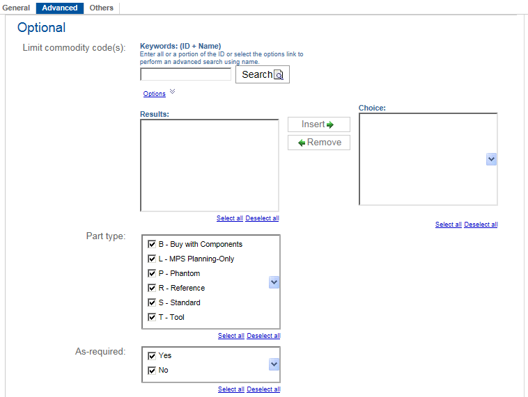 Select the option to indicate which component parts you want to include on this report, based on whether or not the quantity per component part is flagged as "as required," since it would not be practical to specify the exact quantity for this part. Selecting No will include component parts whose exact quantity has been specified. Both options are selected by default. |